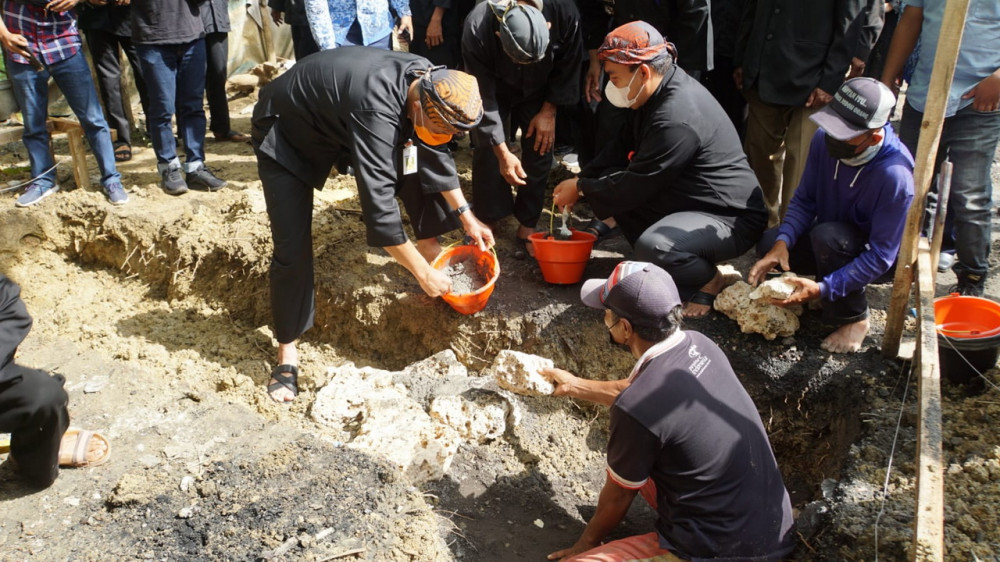 Setibanya di lokasi, kawasan hutan jati yang rindang, Gubernur didampingi Bupati dan Mbah Lasiyo sesepuh Kampung Samin Karangpace melakukan peletakan batu pertama pondasi menara air yang direkatkan dengan adukan semen.
