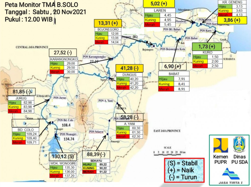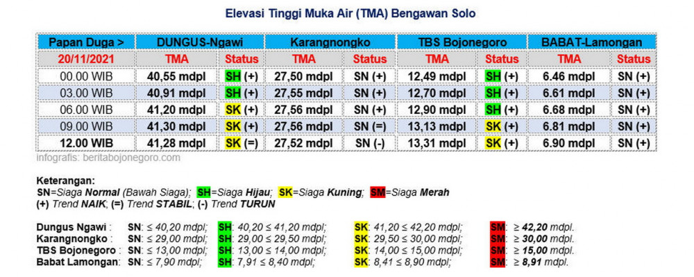 Berikut ini update status TMA Bengawan Solo, yang diterima media ini dari BPBD Bojonegoro, untuk tanggal 20 November 2021, hingga pukul 12.00 WIB.