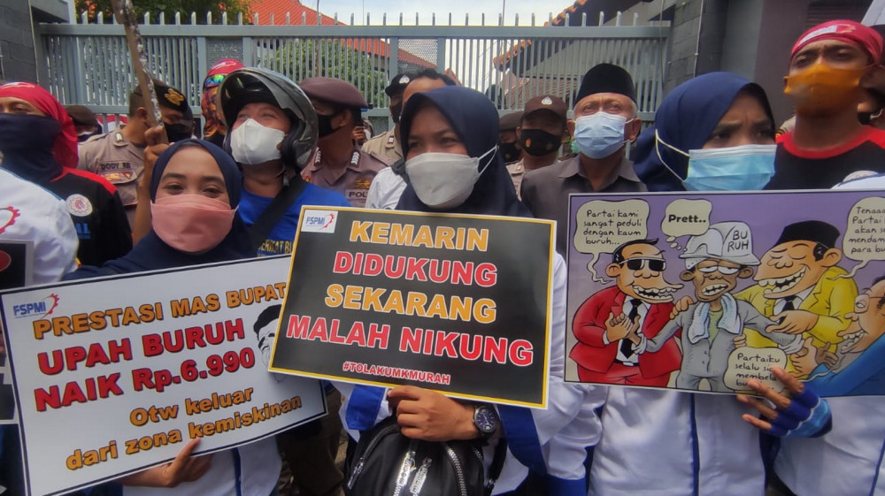 Ratusan buruh atau pekerja saat menggelar aksi unjuk rasa menolak UMK Tuban tahun 2022 yang naik hanya sebesar Rp 6.990. Rabu (24/11/2021) (foto: dok istimewa)