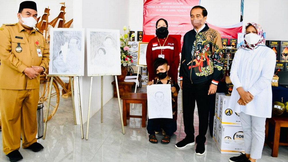 Setelah meninjau gerai batik, Presiden Jokowi dan Ibu Negara Iriana kemudian meninjau gerai yang memamerkan lukisan yang menggambar Presiden Jokowi, Ibu Iriana, dan cucu-cucunya. Presiden pun langsung membeli dua lukisan yang dipajang di gerai tersebut.