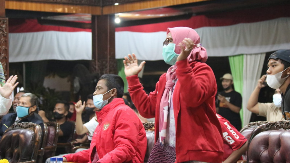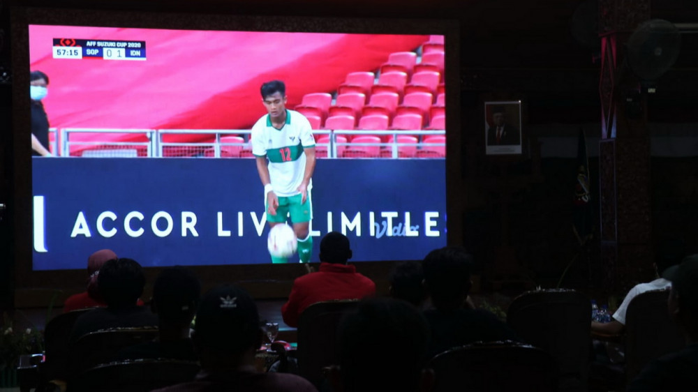Blora - Pertandingan Timnas Indonesia melawan Singapura di Semifinal Leg Pertama Piala AFF 2020, mendapatkan dukungan penuh dari masyarakat Blora, salah satunya dengn menggelar acara Nonton Bareng (Nobar) di Pendopo Rumah Dinas Bupati Blora. Rabu (22/12/2021).