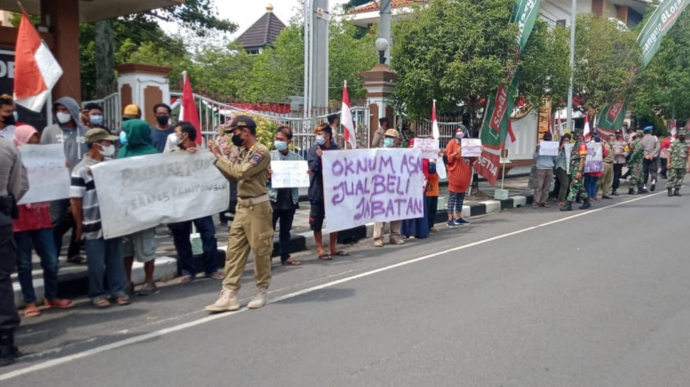Aksi demo tersebut digelar karena adanya dugaan jual beli jabatan dalam pengisian perangkat desa dan tidak transparannya panitia pelaksana pengisian perangkat desa.