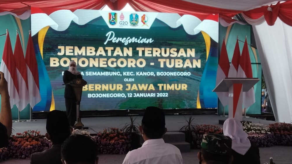 Bojonegoro - Gubernur Jawa Timur Khofifah Indar Parawansa, pada Rabu (12/01/2022), resmikan Jembatan Terusan Bojonegoro-Tuban (TBT), yang membentang di atas Sungai Bengawan Solo, yang menghubungkan Desa Semambung, Kecamatan Kanor, Kabupaten Bojonegoro, dengan Desa Ngadirejo, Kecamatan Rengel, Kabupaten Tuban.