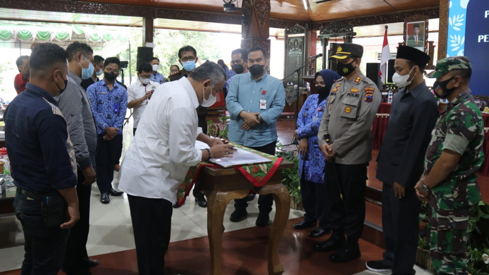 Penanda tanganan perjanjian kerja sama dan pakta integritas antara perguruan tinggi dengan Tim Penjaringan dan Penyaringan Perangkat Desa, terkait pelaksanaan ujian CAT. Senin (17/01/2022) (foto: dok istimewa)
