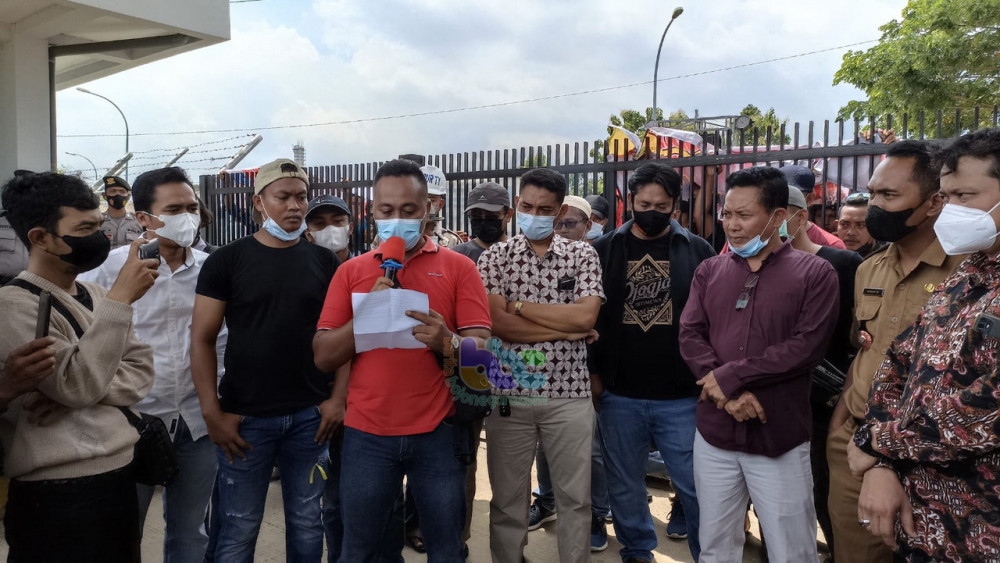Perwakilan pendemo, saat sampaikan tuntutan kepada Pertamina Kilang Minyak Grass Root Refinery (GRR) Tuban. Senin (24/01/2022) (foto: ayu/beritabojonegoro)