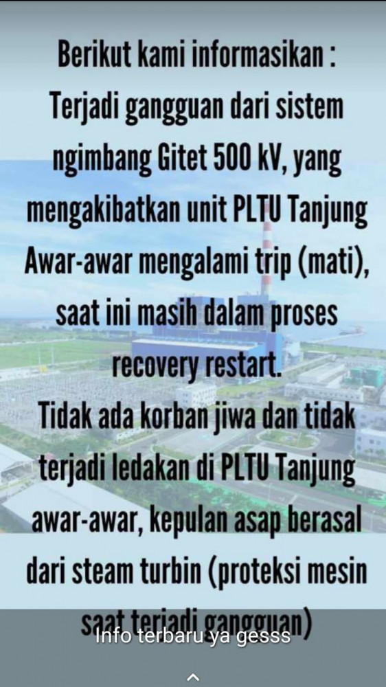 Berikut kami informasikan : Terjadi gangguan dari sistem ngimbang Gitet 500 kV, yang mengakibatkan unit PLTU Tanjung Awar Awar mengalami trip (mati) saat ini masih dalam proses recovery restart.