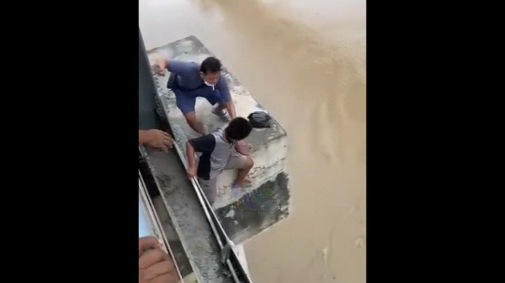 Tangkapan layar saat warga berupaya menyelamatkan pelaku percobaan bunuh diri di Jembatan Kaliketek, di Jalan TGP, Kelurahan Banjarejo, Kecamatan Bojonegoro Kota, Kabupaten Bojonegoro. Minggu (13/02/2022) (Istimewa)