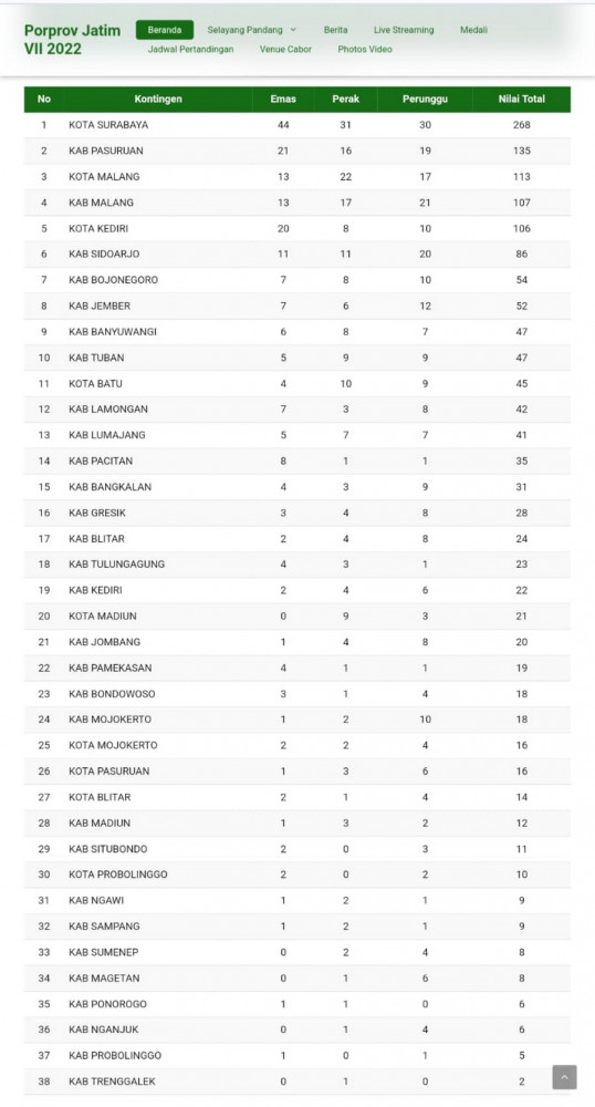 Sementara peringkat pertama ditempati Kota Surabaya dengan total nilai 125 poin, disusul Kabupaten Pasuruan dengan total nilai 135 point, Kota Malang dengan total nilai 113 poin, Kabupaten Malang dengan total nilai 107 poin, Kota Kediri dengan total nilai 106 poin, dan Kabupaten Sidoarjo dengan total nilai 86 poin.