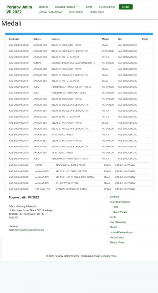Bojongoro - Di hari kedua pelaksanaan Pekan Olahraga Provinsi (Porprov) Jawa Timur (Jatim) ke-7 tahun 2022, Senin (27/06/2022), kontingen Kabupaten Bojonegoro berhasil mengumpulkan tujuh medali emas, delapan medali perak, dan sepuluh medali perunggu.