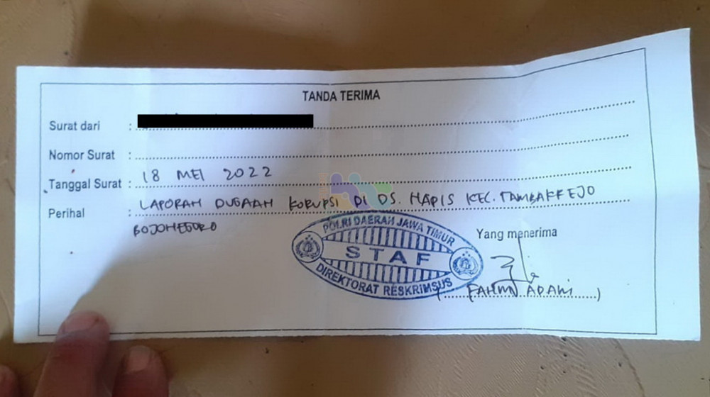 Surat tanda terima laporan dari Polda Jatim terkait kasus dugaan tindak pidana korupsi di Desa Napis, Kecamatan Tambakrejo, Bojonegoro. (foto: dok istimewa)