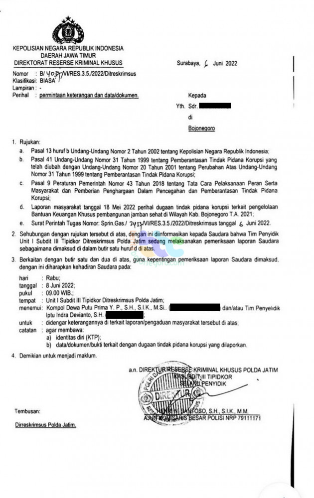 Surat panggilan dari Polda Jatim untuk saksi pelapor kasus dugaan tindak pidana korupsi di Desa Napis, Kecamatan Tambakrejo, Bojonegoro. (foto: dok istimewa)