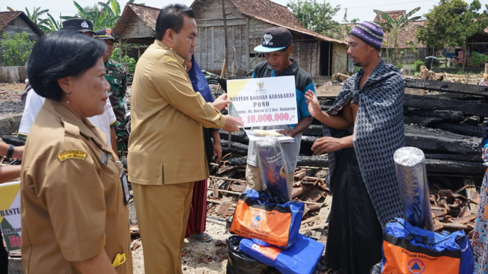 Pada kesempatan tersebut, Bupati Arief Rohman didampingi Kepala Dinsos P3A, pimpinan Baznas, Kalak BPBD dan Camat Banjarejo bersama Kades Bacem, menyerahkan bantuan dana sosial senilai masing-masing Rp 10 juta untuk keluarga Marfuah dan Pono.