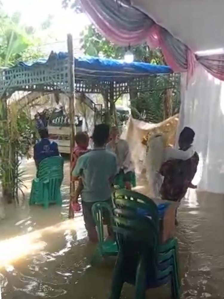 Dalam video tersebut tampak hajatan atau resepsi pernikahan tetap dilangsungkan meskipun banjir menggenangi lokasi hajatan.