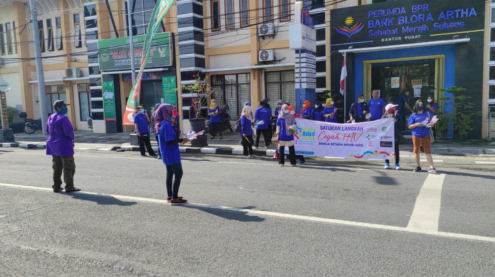 Blora - Memperingati Hari HIV/AIDS Sedunia atau World AIDS Day yang diperingati setiap tanggal 1 Desember, Dinas Kesehatan (Dinkes) Kabupaten Blora bersama sejumlah aktivis dan penyintas AIDS, melaksanakan aksi turun ke jalan dengan membagikan bunga dan brosur tentang HIV/AIDS, kepada pengendara yang melintas di jalan protokol di Kota Blora, tepatnya di Simpang Empat MD Blora. Kamis (01/12/2022).