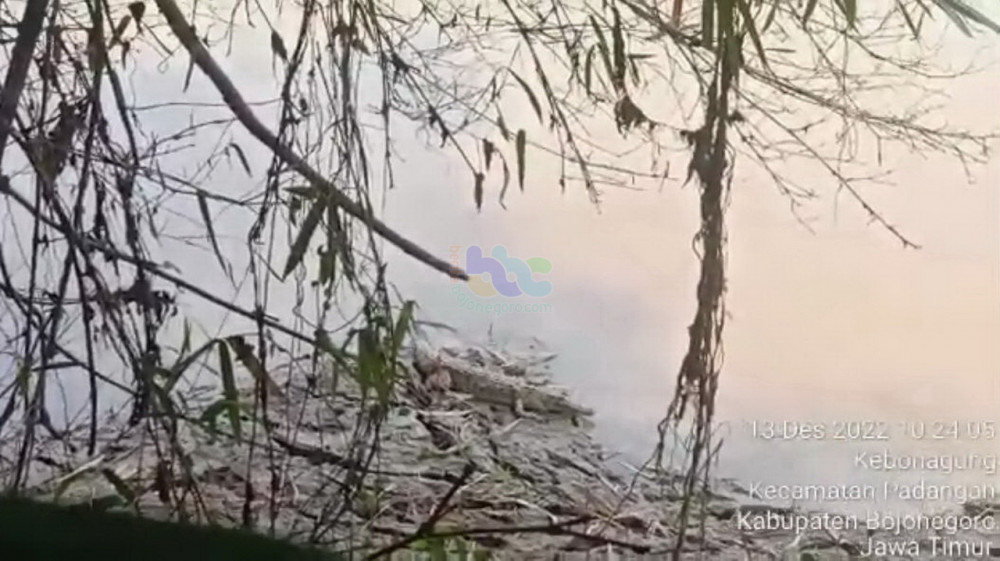 Bojonegoro - Seekor buaya kembali muncul di tepian Sungai Bengawan Solo, di Desa Kebonagung RT 007 RW 003, Kecamatan Padangan, Kabupaten Bojonegoro, Jawa Timur, Selasa (13/12/2022).