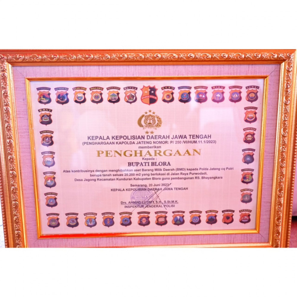 Piagam pengharaan dari Kalpolda Jateng untuk Bupati Blora atas kontribusinya dalam mendukung RS Bhayangkara oleh Polri