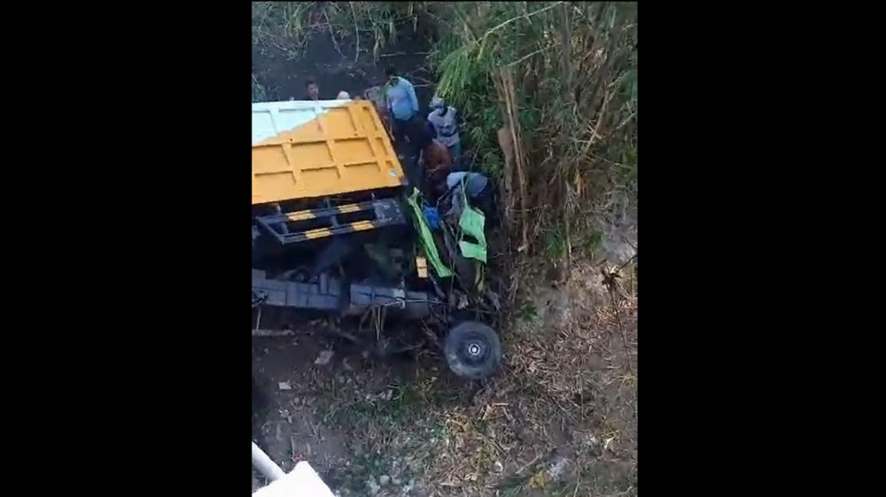 Kendaraan dump truk yang belum diketahui penyebabnya tiba-tiba oleng ke kanan dan menabrak pagar pembatas jembatan, selanjutnya truk tersebut terus melaju hingga terjun dan terjatuh ke kali di bawah jembatan.