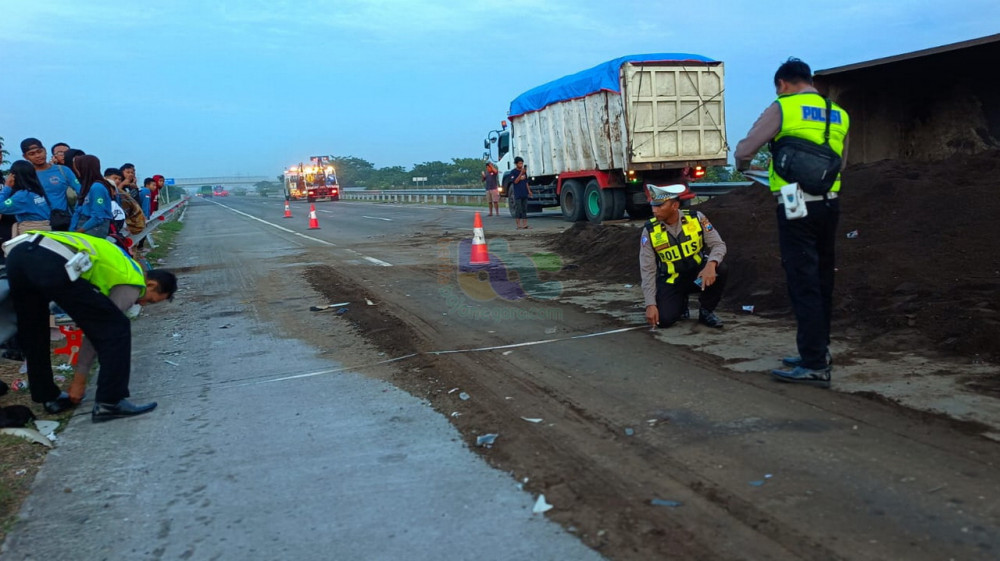 “Posisi akhir kendaraan dump truk berhenti terguling di bahu jalan sebelah kanan dengan muatan tercecer di lajur cepat dan lajur lambat. Untuk kendaraan bus berhenti di lajur bahu luar menghadap ke barat.” kata AKP Deni Eko Prasetyo.