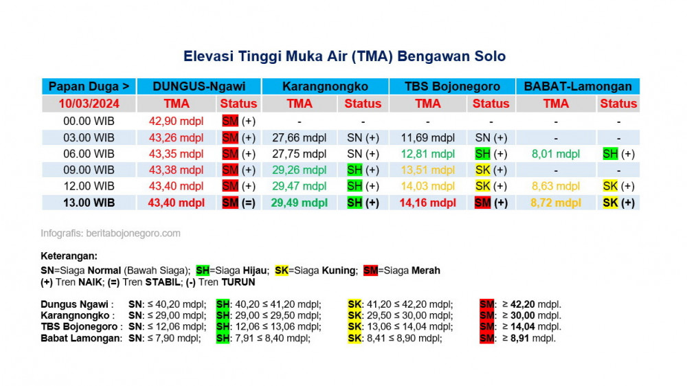 Berdasarkan data yang dihimpun dari Pusat Pengendalian Operasi (Pusdalops) Badan Penanggulangan Bencana Daerah (BPBD) Kabupaten Bojonegoro, TMA Sungai Bengawan Solo di papan duga TBS Bojonegoro Kota berada pada angka 14.16 mdpl atau masuk status siaga merah dengan tren masih mengalami kenaikan.