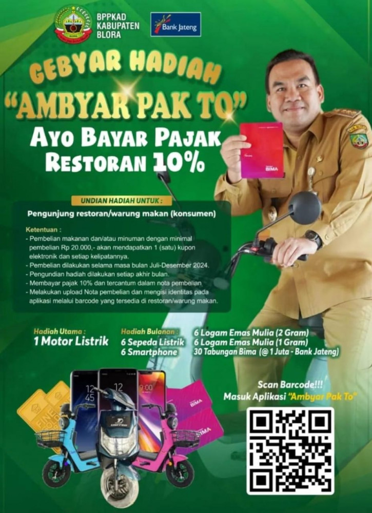 Blora- Sebagai bentuk apresiasi sekaligus upaya meningkatkan wawasan masyarakat terkait pajak restoran sebesar 10 persen, Pemerintah Kabupaten Blora menghadirkan inovasi program “AmByar Pak To” atau Ayo Bayar Pajak Restoran.