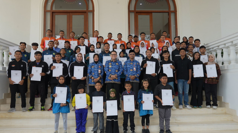Pemuda-pemudi Bojonegoro berprestasi saat foto bersama usai menerima bonus dari Pemkab Bojonegoro. Rabu (17/07/2024). (Aset: Istimewa)
