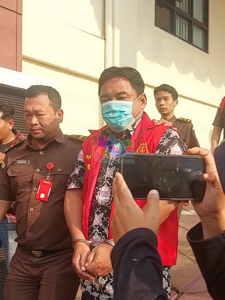 Tersangka AW, oknum Kepala Desa di Kecamatan Sumberrejo, Bojonegoro, saat dilakukan penahanan oleh Kejaksaan Negeri Bojonegoro. Rabu (21/08/2024) (Aset: Imam Nurcahyo/BeritaBojonegoro)