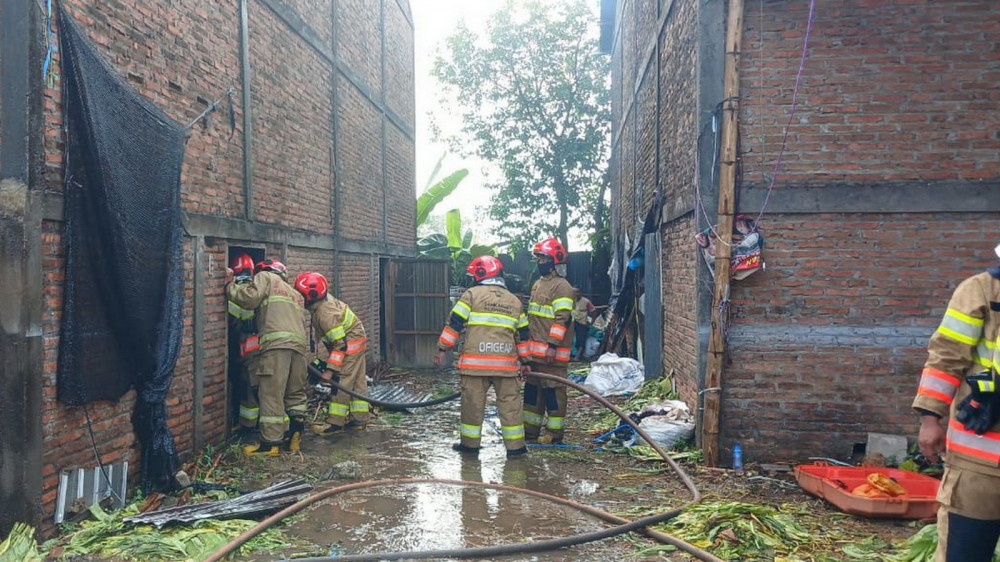 Petugas saat lakukan pemadaman kebakaran gudang pengeringan tembakau (oven) di Dusun Jatimalang, Desa Klepek, Kecamatan Sukosewu, Kabupaten Bojonegoro, Jawa Timur. Sabtu (14/09/2024). (Aset: Istimewa)