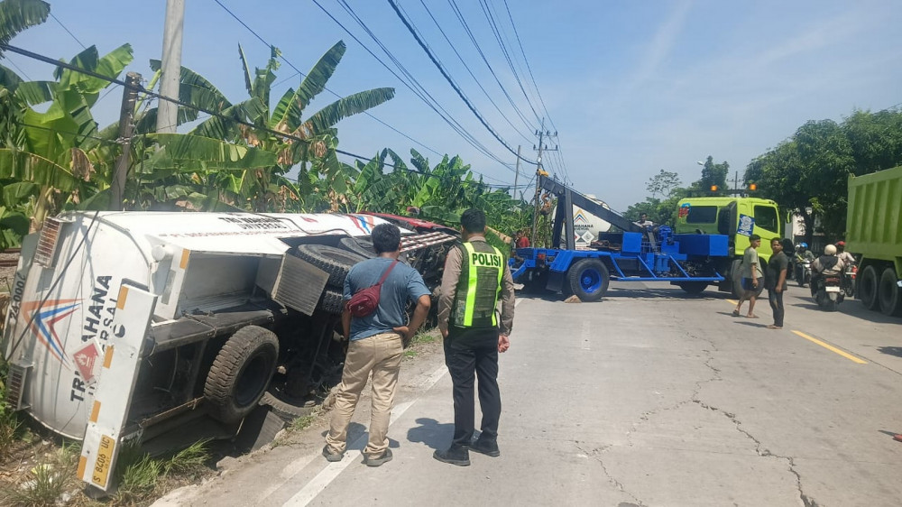 Diduga Sopir Mengantuk, Truk Tangki di Kalitidu, Bojonegoro Terperosok dan Terguling di Bahu Jalan