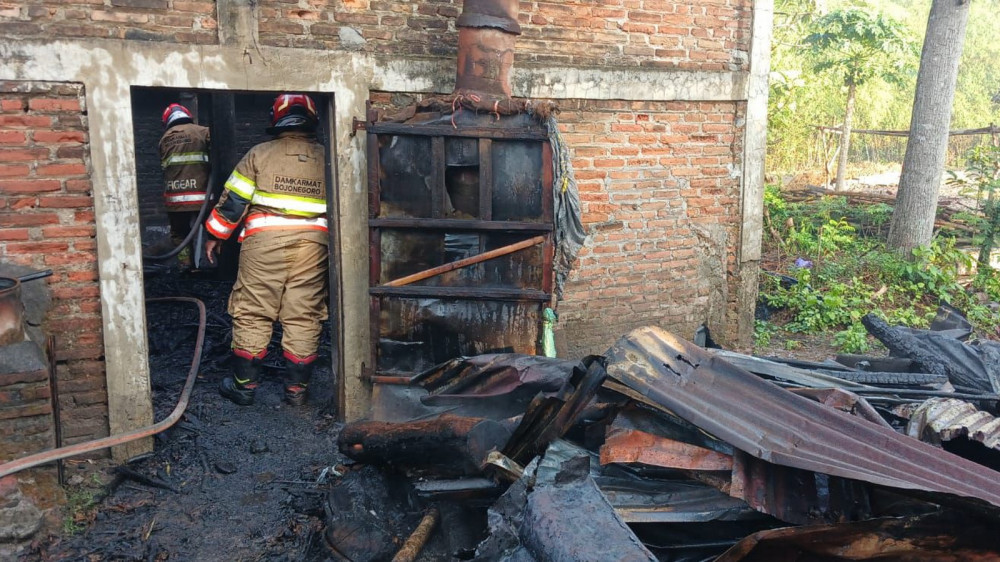 Petugas saat lakukan pemadaman kebakaran gudang pengeringan tembakau (oven) di Desa Sitiaji, Kecamatan Sukosewu, Kabupaten Bojonegoro, Jawa Timur. Selasa (05/11/2024). (Aset: Istimewa)
