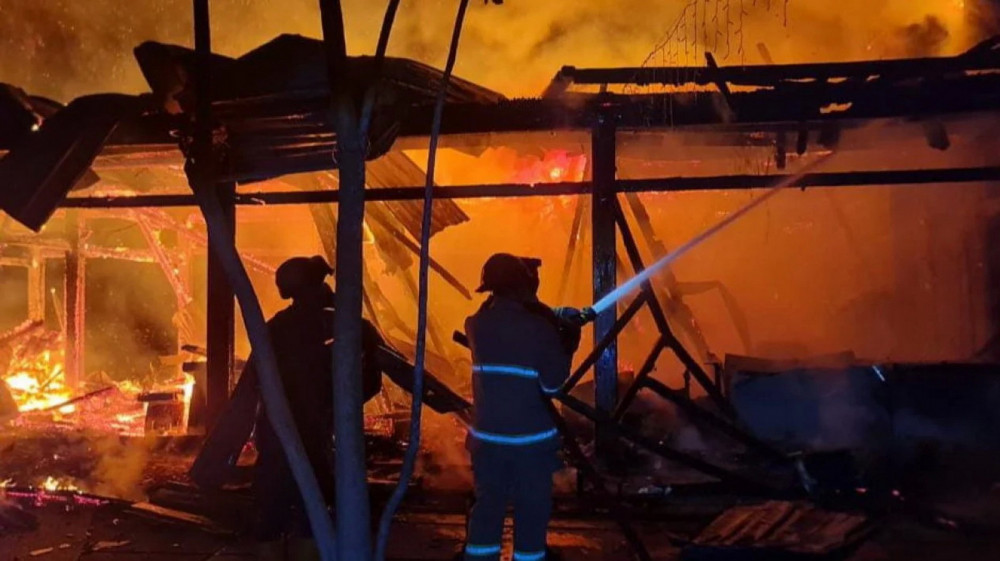 Petugas saat memadamkan api kebakaran Mahkota Cafe Love Garden di Jalan Raya Babat-Jombang, Desa Karang Kembang, Kecamatan Babat, Kabupaten Lamongan, Jawa Timur. Minggu (9/02/2025) (Aset: Istimewa)