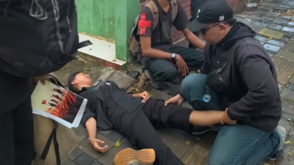 Salah satu pendemo yang menolak pengesahan Revisi Undang-Undang (UU) TNI, saat mendapatkan perawatan medis. Kamis (27/03/2025). (Aset: beritabojonegoro)