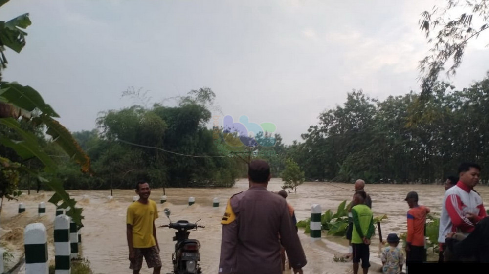 Di Desa Tlatah, luapan banjir menggenangi jembatan penghubung Desa Tlatah, Kecamatan Purwosari dengan Desa Mojodelik, Kecamatan Gayam.