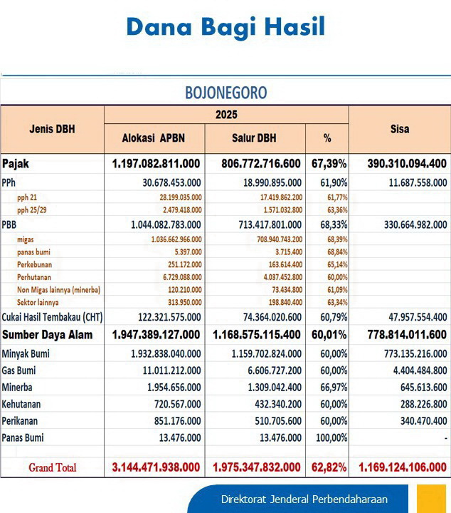 Bojonegoro - Pada bulan Agustus 2025 ini, Pemerintah Kabupaten (Pemkab) Bojonegoro menerima penyaluran Dana Bagi Hasil (DBH) dari Pemerintah Pusat sebesar Rp 416.806.814.200.