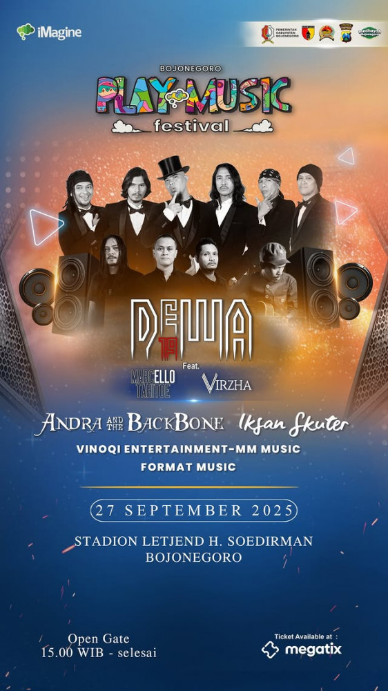 Bojonegoro - Konser Band legendaris Dewa 19 dengan formasi Virzha dan Ello, bersama Andra and The Backbone dan Iksan Skuter bertajuk Bojonegoro Play Music Festival 2025 bakal digelar di Stadion Letjen H Soedirman, Bojonegoro, Jawa Timur. Sabtu (27/09/2025) mendatang.