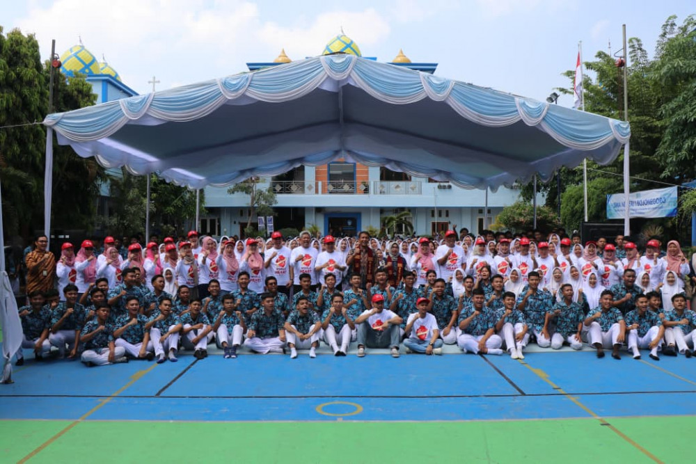 Foto bersama Bupati Bojonegoro dan Ketua TP PKK bersama para siswa dan guru SMA Negeri 1 Bojonegoro, Kamis (25/09/2025). (Aset: Istimewa)