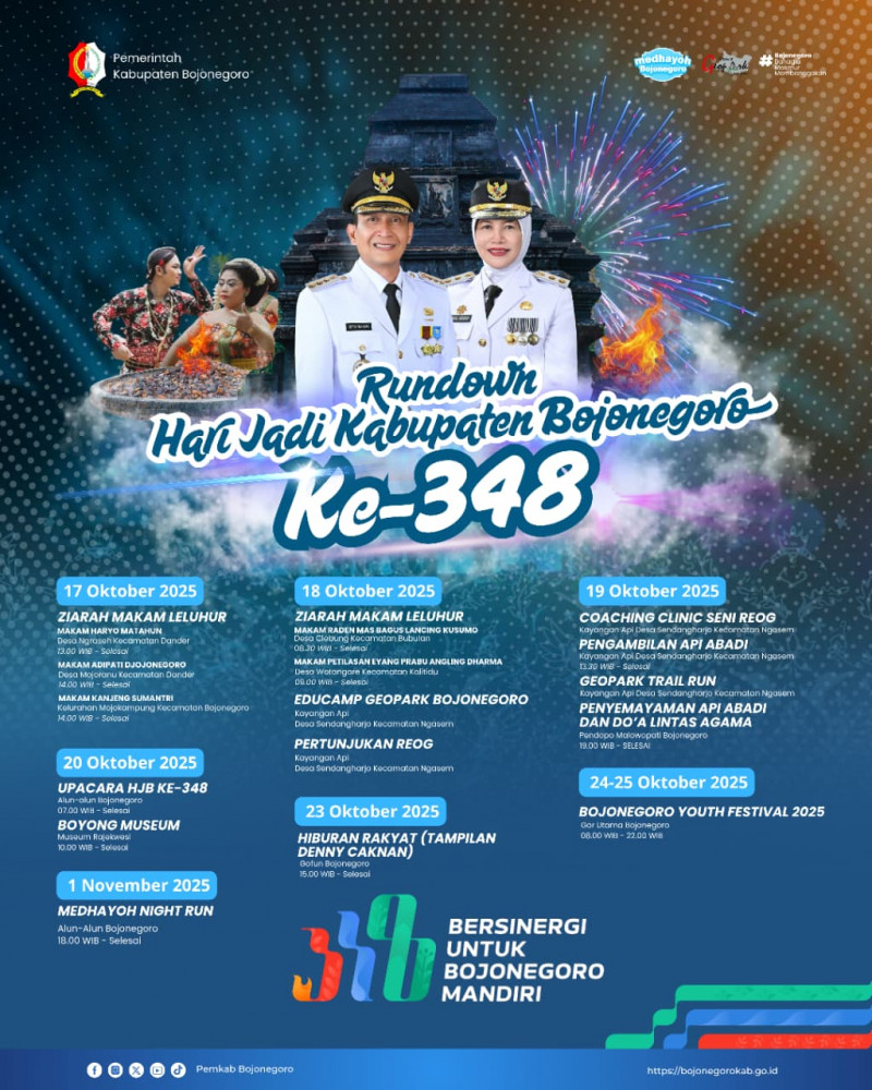 Bojonegoro - Pemerintah Kabupaten (Pemkab) Bojonegoro, telah mengagendakan sejumlah acara untuk memperingati Hari Jadi Kabupaten Bojonegoro (HJB) ke-348 yang jatuh pada Senin (20/10/2025).