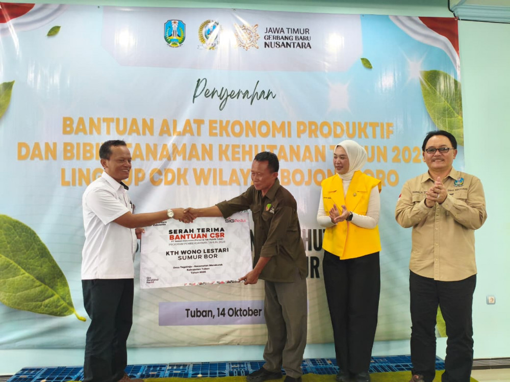Tuban - PT Semen Indonesia (Persero) Tbk (SIG) Pabrik Tuban menyerahkan bantuan sumur bor untuk Kelompok Tani Hutan (KTH) Wono Lestari, Desa Tegalrejo, Kecamatan Merakurak, Kabupaten Tuban, Selasa (14/10/2025) bertempat di aula Kantor Himpunan Penduduk Pemakai Air Minum (HIPPAM) Tirto Moro. Penyaluran bantuan tersebut dilaksanakan pada kegiatan penyerahan bantuan alat ekonomi produktif dan bibit tanaman oleh Dinas Kehutanan Provinsi Jawa Timur dan DPRD Provinsi Jawa Timur.