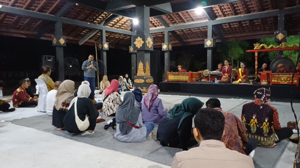 Asisten Perekonomian dan Pembangunan Pemkab Bojonegoro Drs Kusnandaka Tjatur, saat beri sambutan di Kayangan Api di Kecamatan Ngasem, Bojonegoro. Sabtu malam (17/11/2026) (Aset: imam/beritabojonegoro)