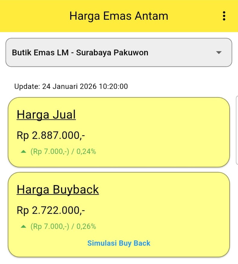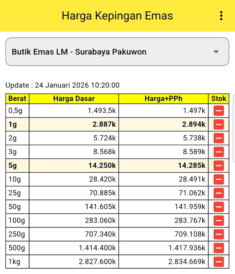 Berikut rincian harga emas batangan di Butik Emas LM ANTAM Surabaya Pakuwon, Surabaya, update hari ini Sabtu, 24 Januari 2026 pukul 10.20 WIB: