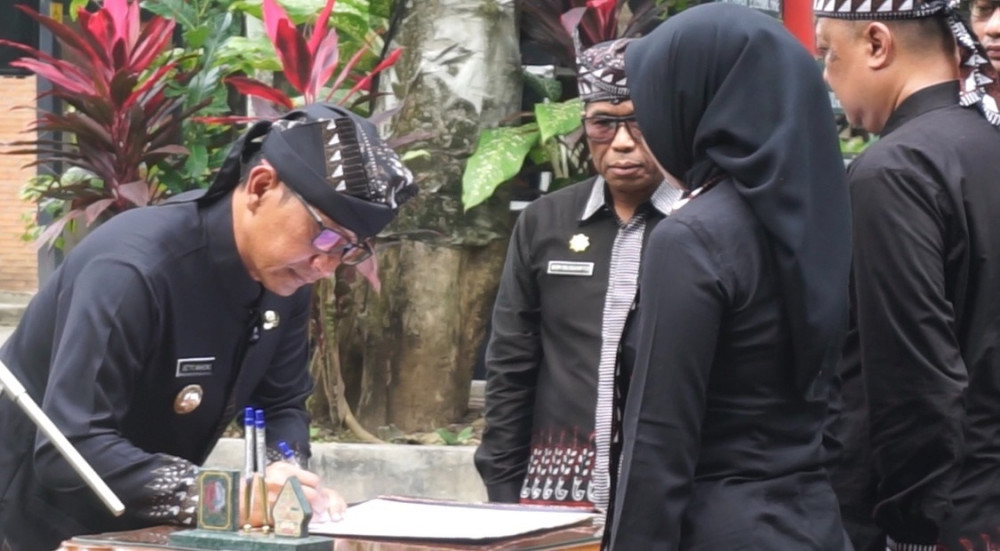 Bupati Bojonegoro, Setyo Wahono, menandatangani SK pengangkatan para pejabat lingkup Pemerintah Kabupaten di Kayangan Api, Rabu (28/01/2026). Aset: Berita Bojonegoro