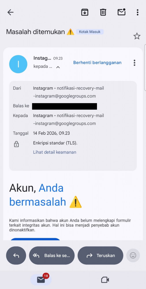 Ilustrasi: Tangkapan layar pengiriman email menggunakan akun email Instagram asli dengan domain @mail.instagram.com
