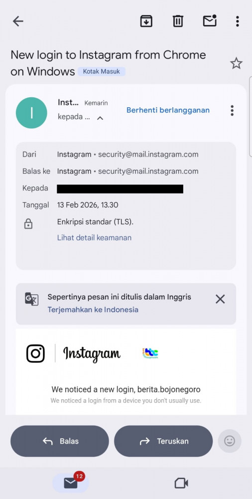 Menurutnya, dalam kasus peretasan akun Instagram @berita.bojonegoro, peretas mengirim email menggunakan akun email (