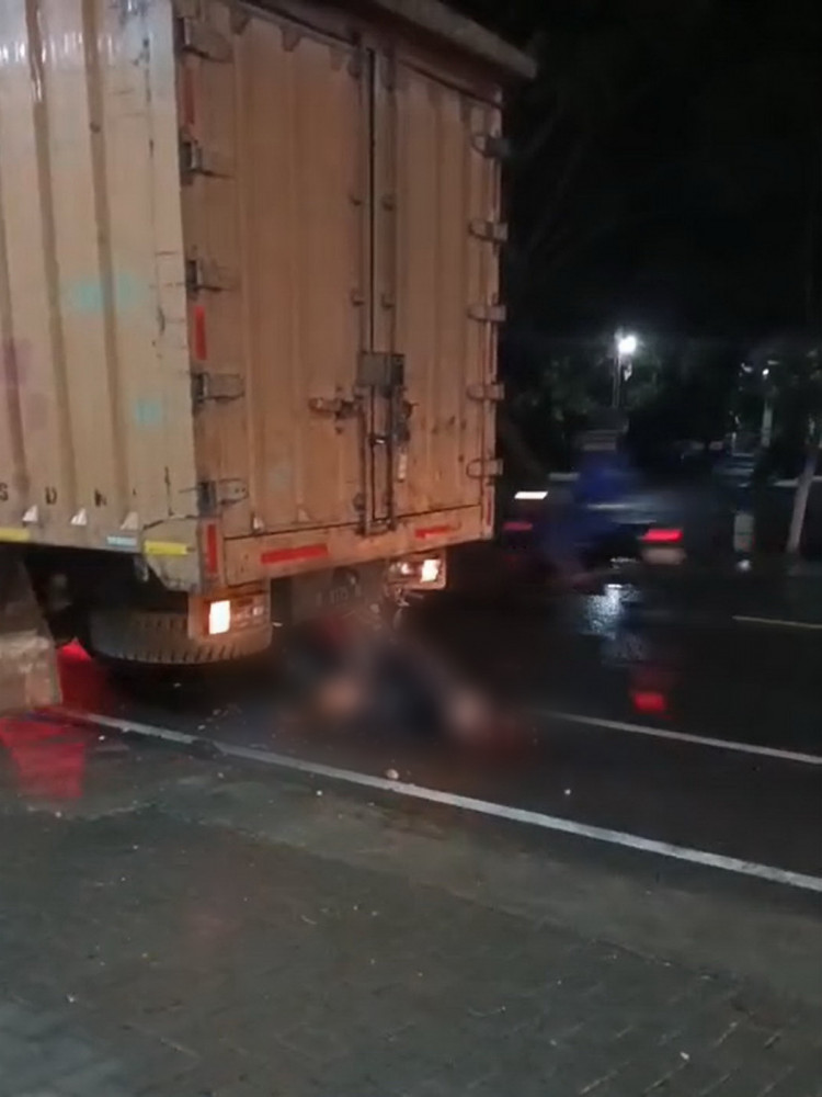Truk boks Fuso yang hendak berhenti untuk mengecek kondisi ban, ditabrak sepeda motor Honda Beat yang melaju dari arah belakang. Akibatnya, pengendara motor dan pemboncengnya meninggal dunia di lokasi kejadian atau tempat kejadian perkara (TKP).