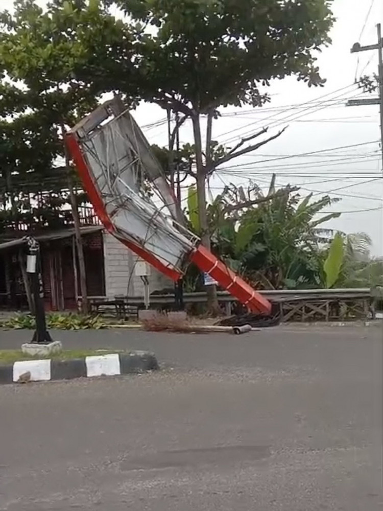 Kondisi papan reklame yang roboh di pertigaan Jembatan Glendeng, di Desa Kalirejo, Kecamatan Bojonegoro, Kabupaten Bojonegoro, Jawa Timur. Rabu (08/04/2026). (Aset: Istimewa)