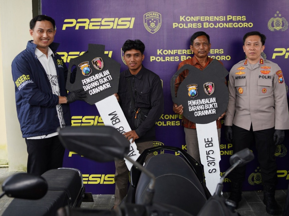Polres Bojonegoro mengembalikan secara simbolis kedua kendaraan bermotor yang jadi barang bukti kasus pencurian kepada para pemiliknya, Rabu (15/04/2026). Aset: Istimewa